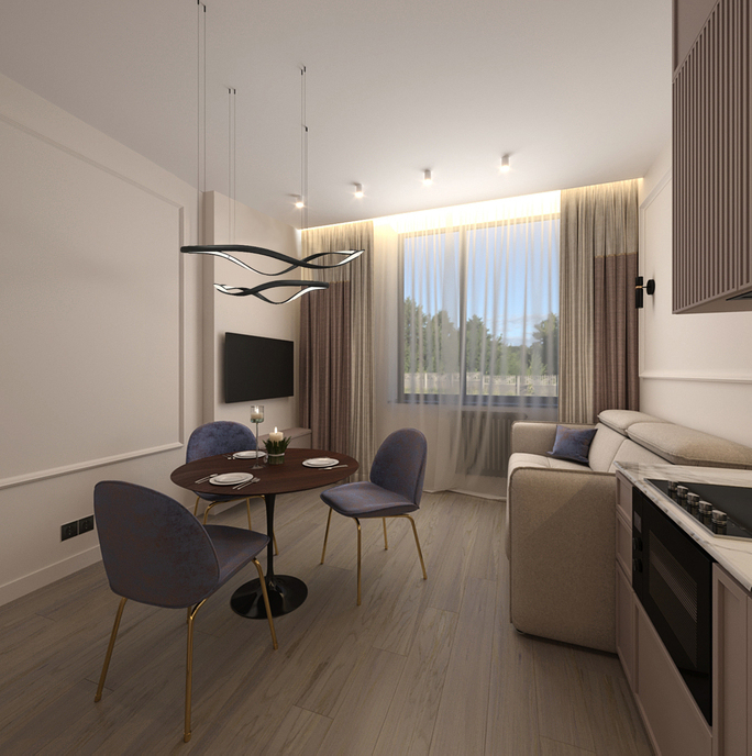 Интерьер квартиры в тёплых тонах, 53 кв., в ЖК Headliner