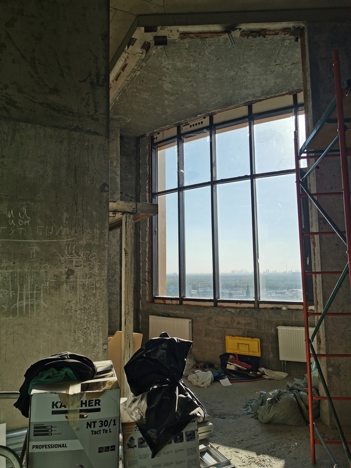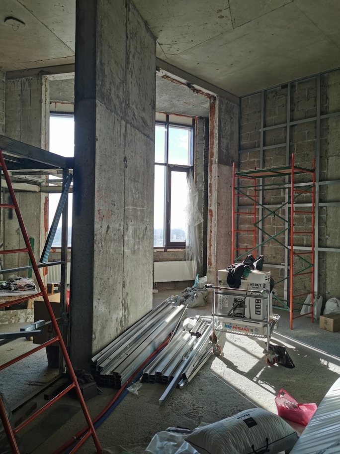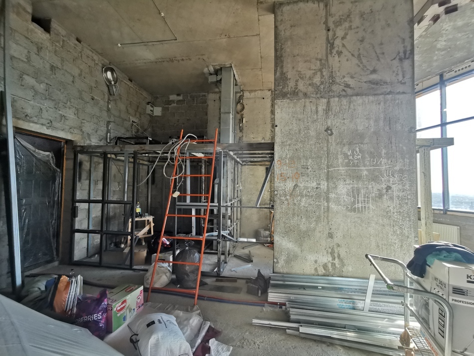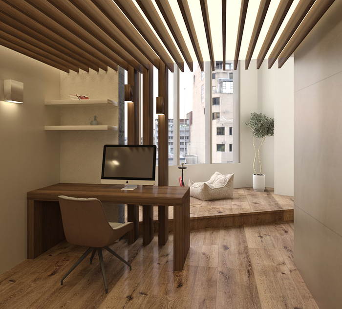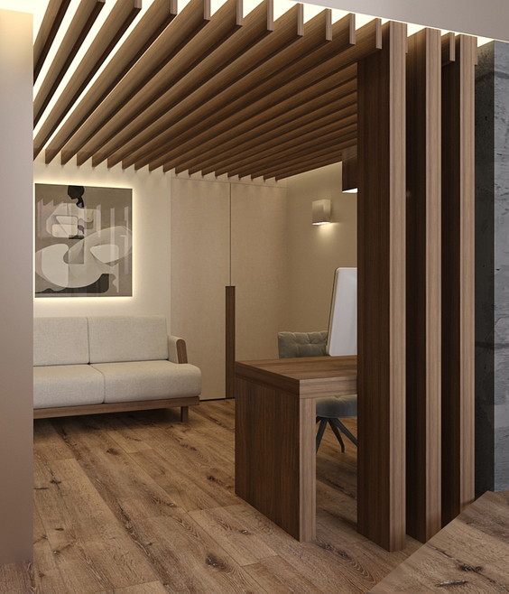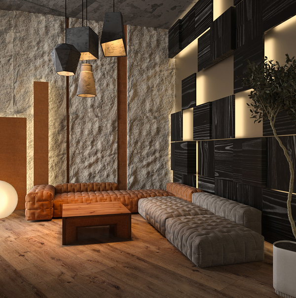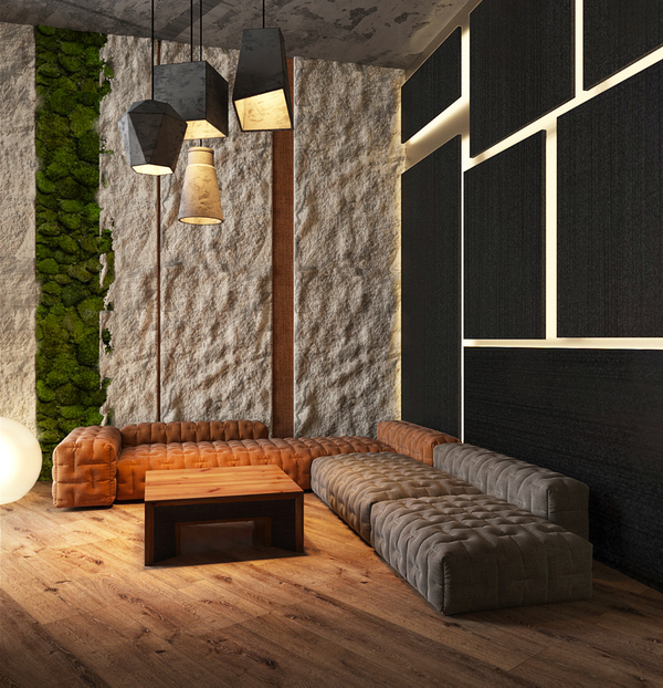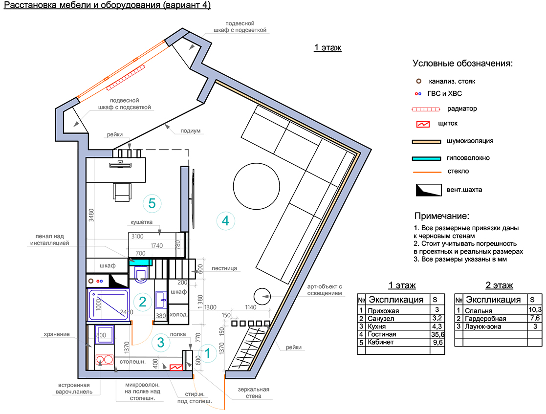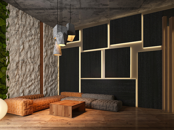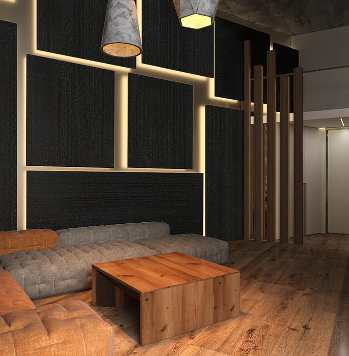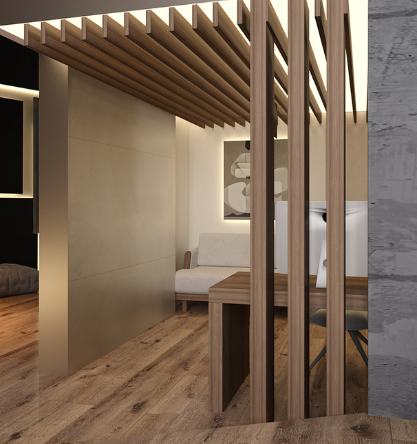 У нас было небольшое помещение с высокими потолками (почти 5 м) и высокими окнами. Площади хозяину не хватало, поэтому первое, что мы сделали, возвели 2 этаж. На нём спроектировали спальню, гардеробную и лаунж-зону. По плану, слева от прихожей располагался большой санузел, но такая площадь санузла заказчику была ни к чему, поэтому мы её разделили на две зоны: маленький санузел и маленькая кухня. Заказчик живёт один, готовит мало, поэтому для него это оптимально. Чтобы прихожую визуально отгородить от гостиной, я использовал шпонированные рейки. Гостиная получилась просторная, со вторым светом. Под вторым этажом я разместил кабинет – хозяин много работает, поэтому кабинет имеет для него большое значение. У окна я сделал небольшую зону кальянной, выделив эту зону подиумом.