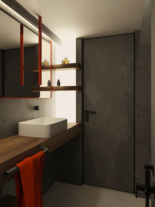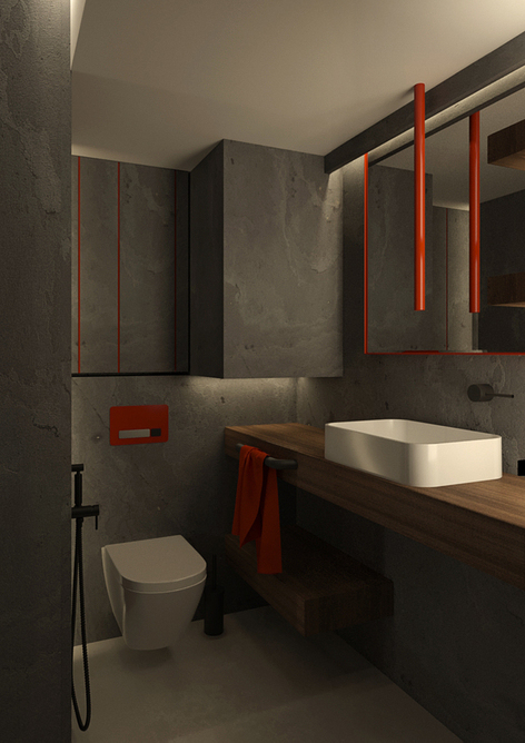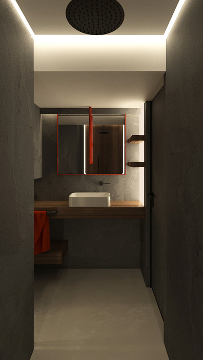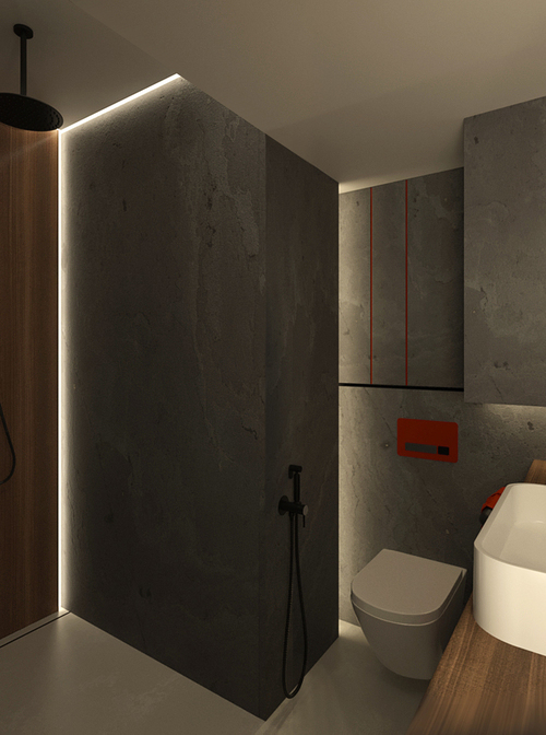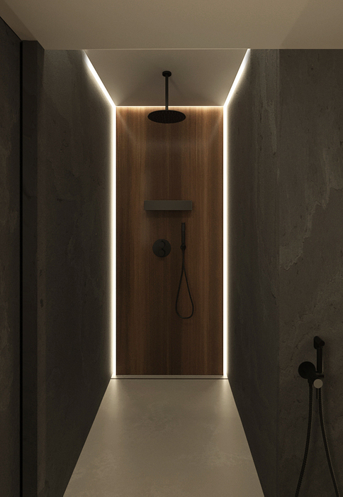 Из кухни переходим в санузел. Дверь скрытая, до потолка. Со стороны санузла дверь облицована каменным шпоном, который продолжается по стенам. На полу – кварцевый агломерат. Излив из потолка будем делать сами – готовый стоит космических денег. Выступающий объём из стены – за ним лестница на 2 этаж. На стене душевой использован лист керамогранита под дерево 240х120 см, за ним подсветка. Светящаяся ниша сбоку унитаза – там спрятанные полки для туалетной бумаги и т.д. Сифон под раковиной 10 см. Пол с душевой в один уровень, с минимальным уклоном. Основного освещения нет. Использован отражённый свет. Дополнительным световым акцентом служит светящаяся стенка с полочками сбоку раковины. Сделана она из оргстекла.