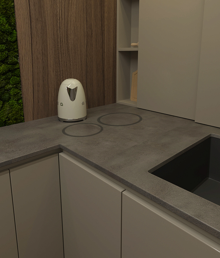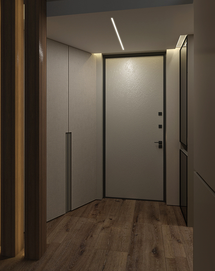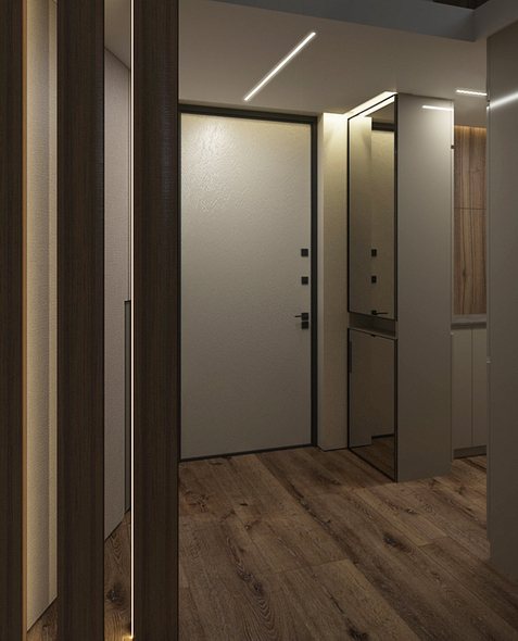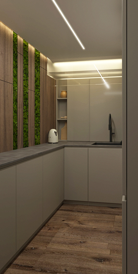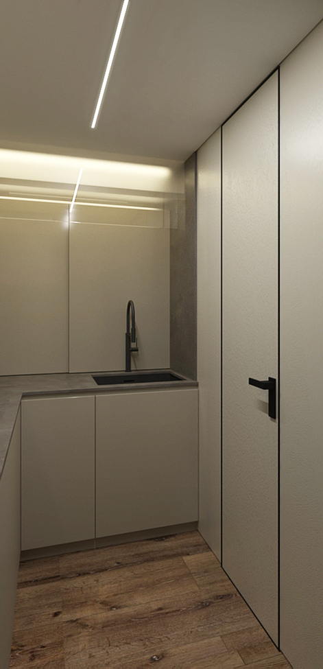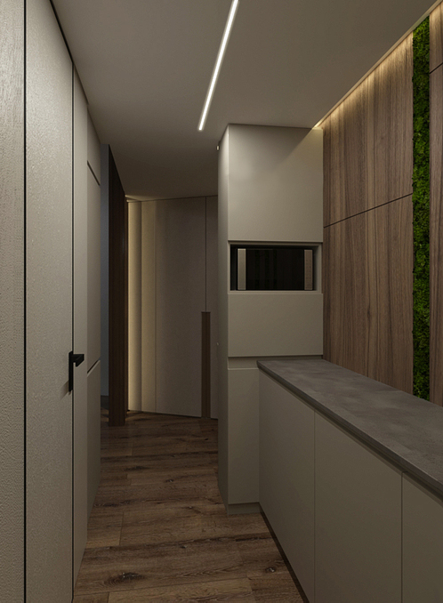 Стиль для дизайна квартиры был выбран минимализм в приглушённых пещерных тонах. Как заходим в прихожую – справа шкаф для одежды, слева – зеркальный шкафчик для обуви, шапок, шарфов, перчаток и ниша для ключей и тд. Этот шкафчик разделяет прихожую и кухню. Со стороны кухни в этом шкафчике – микроволновка. Далее, от шкафчика вдоль стены идут нижние кухонные ящики глубиной 40 см с заворотом на другую стену уже со стандартной глубиной 60 см. На стене вместо фартука-керамогранит под дерево с искусственным мхом. Столешница из керамогранита «под бетон» со встроенной варочной панелью из двух конфорок. Вытяжка спряталась за подсвеченным стеклом. Вся посуда уместилась в системе хранения за мойкой и варочной панелью. На потолке - линейный светильник, как и в прихожей. В пенале с СВЧ уместится бытовая техника.