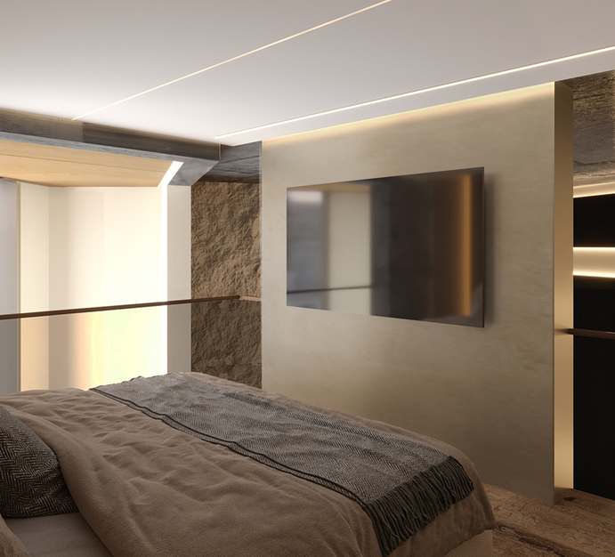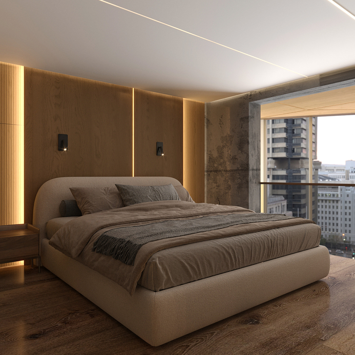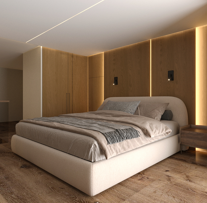 В спальне стена за кроватью выложена шпонированными панелями в 2 уровня, между которыми – тёплая светодиодная подсветка. Эти панели переходят на фасад шкафа. Маленький боковой кусочек стены оставлен в бетоне, и покрыт лаком. Далее, спальню отгораживают стеклянные перила. Напротив кровати – несущая колонна, отеланная теми же бамбуковыми панелями под металл, что и на 1 этаже. На потолке – встроенный длинный линейный светильник.