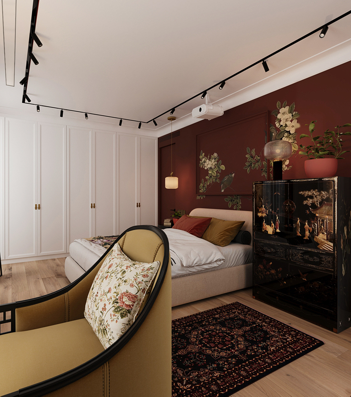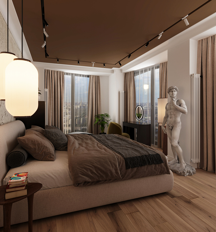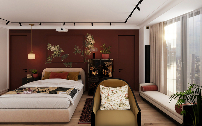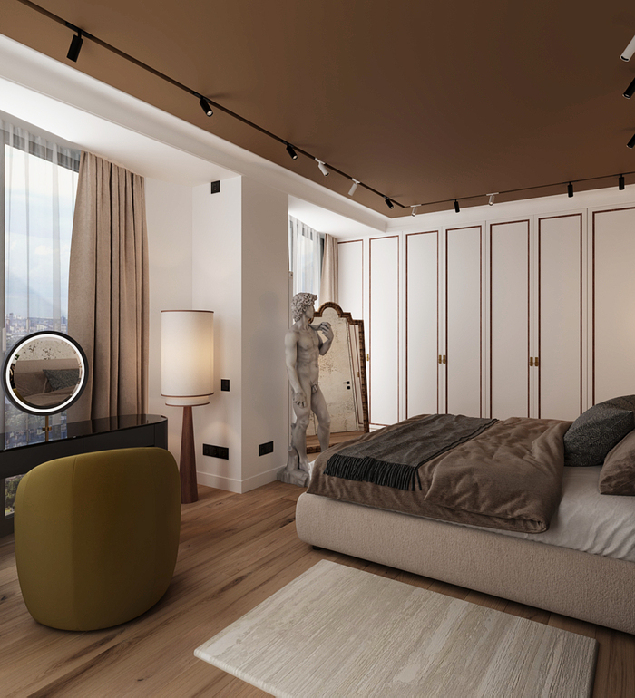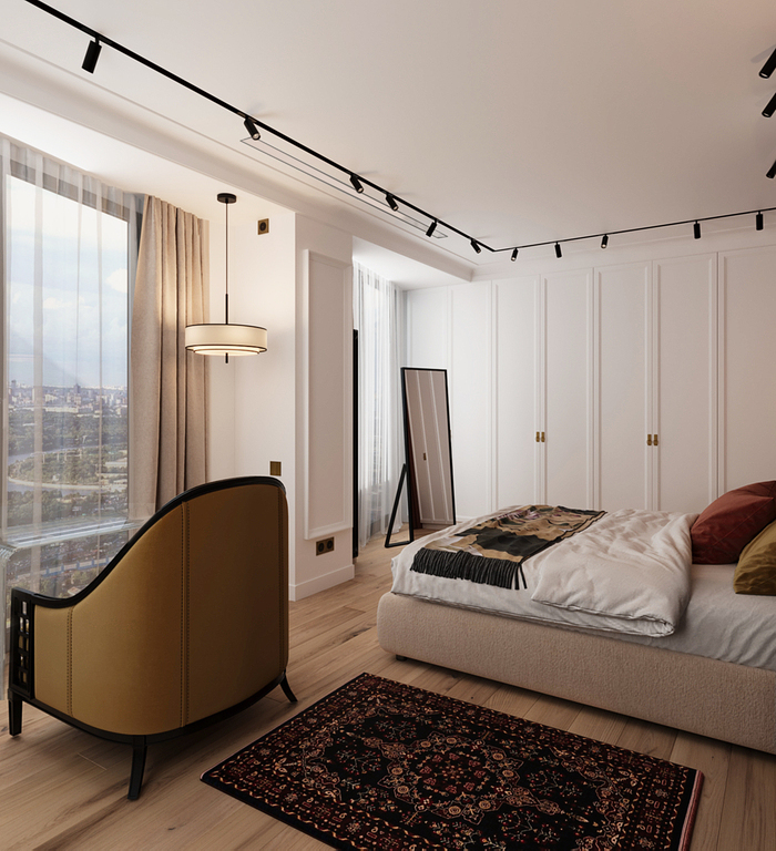 Нужно было создать очень индивидуальный интерьер для девушки, которая хотела совместить предметы винтажа с современным стилем. В спальне нужно было предусмотреть много зон, поэтому из двух маленьких комнат мы сделали большую мастер-спальню.