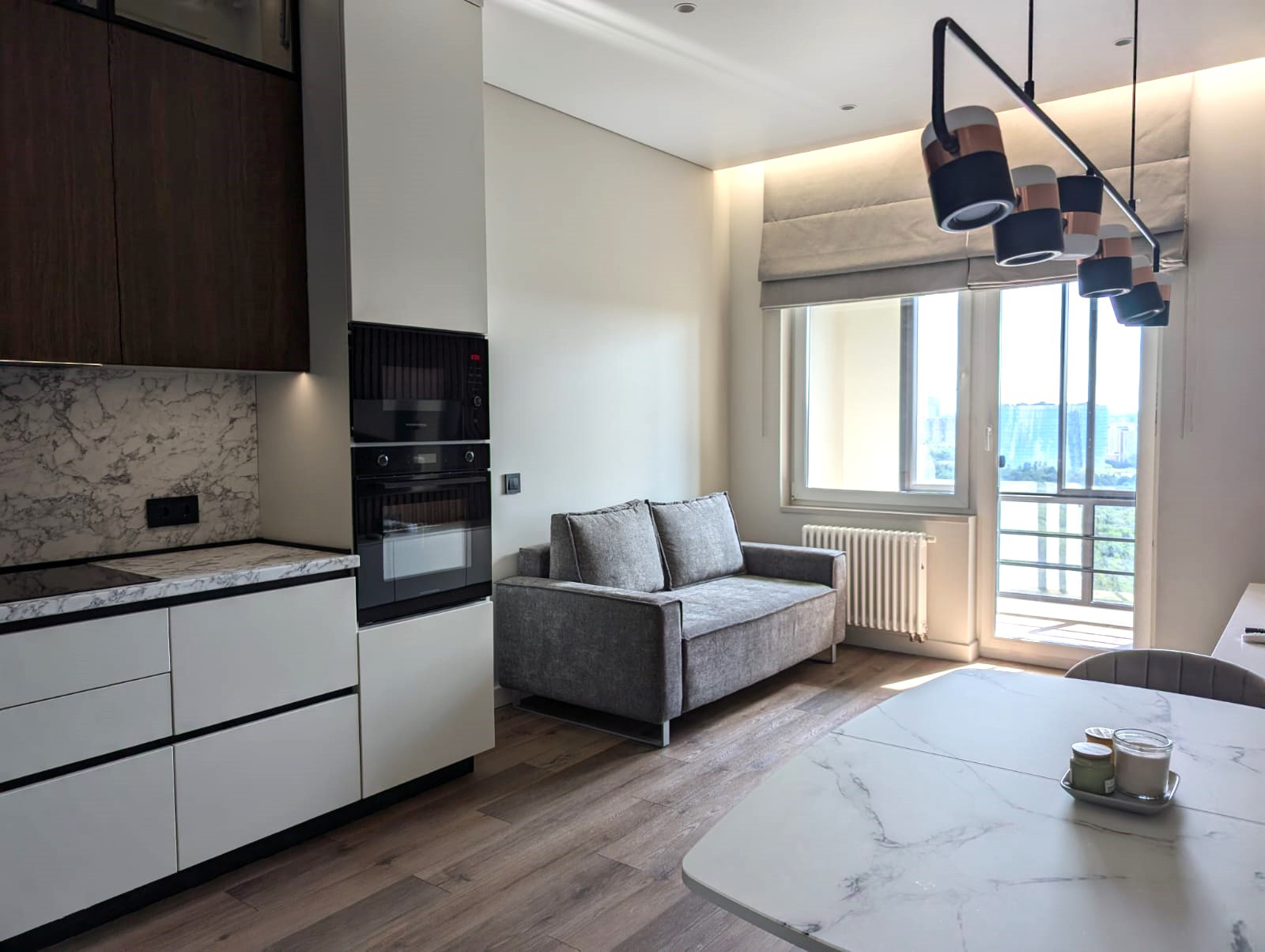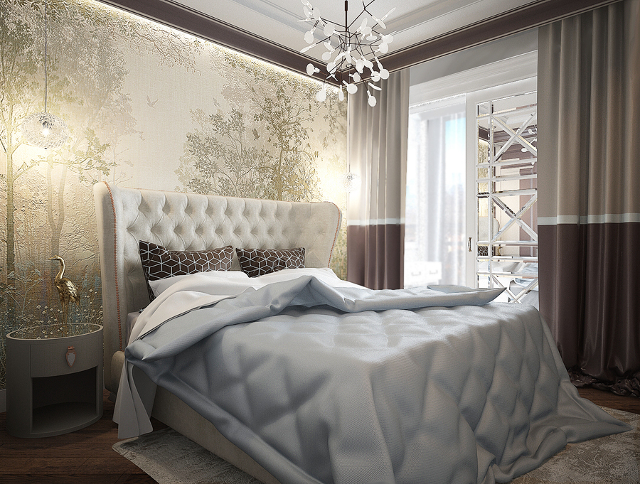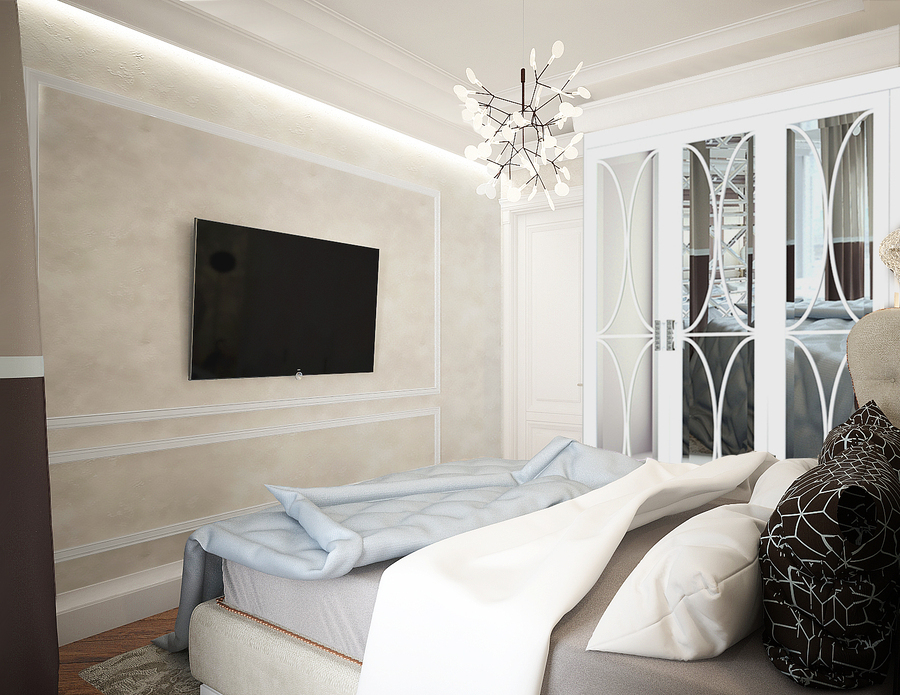 Спальня с раскладным диваном в квартире под сдачу. Предусмотрены: внутрипольный конвектор, закарнизная подсветка по всему периметру, подсветка за зеркалом. Заказчики из Башкирии, поэтому над диваном имеется панно в виде пчелиных сот :)
