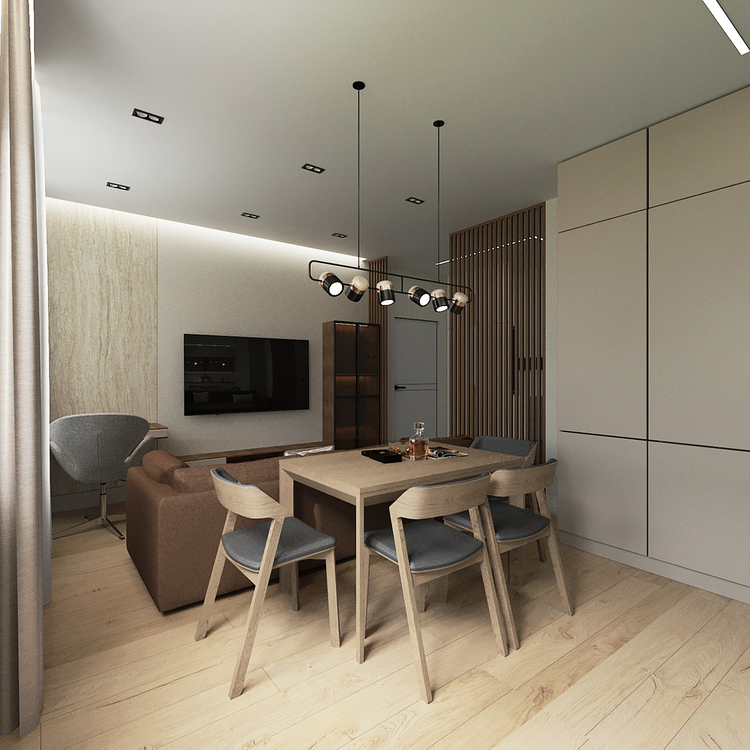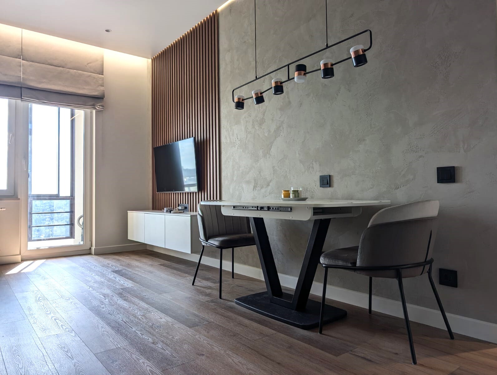 Заказчики хотели видеть современную Европу. Лаконичность, натуральность стояли в приоритете. Одной из основных задач было обыграть черновой потолок, который весь "усыпан" балками; и с уклоном. В двух местах между балками установлены магнитные шинопроводы. Комната из-за них кажется шире.