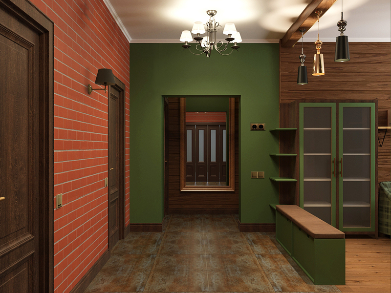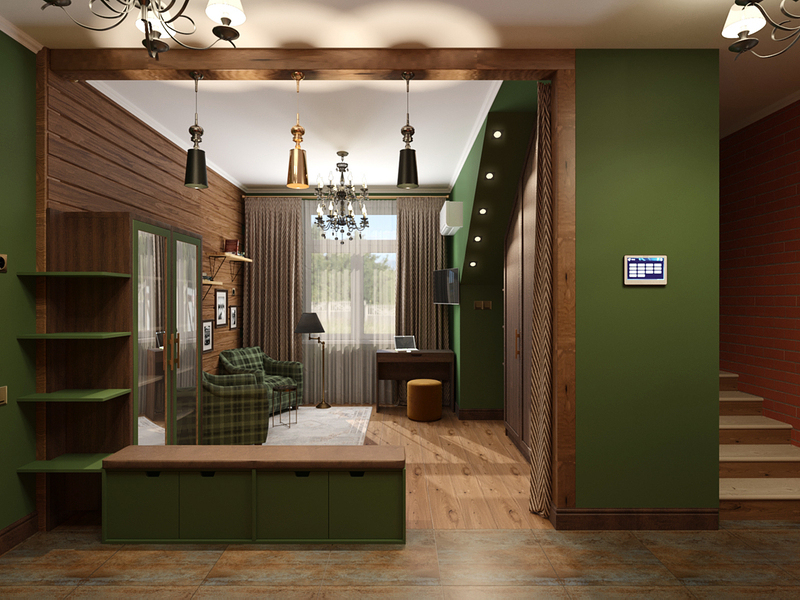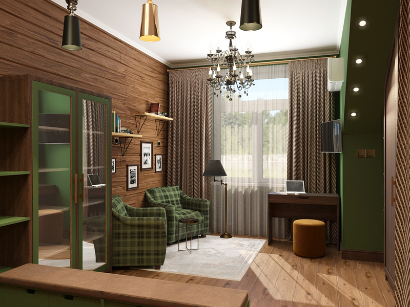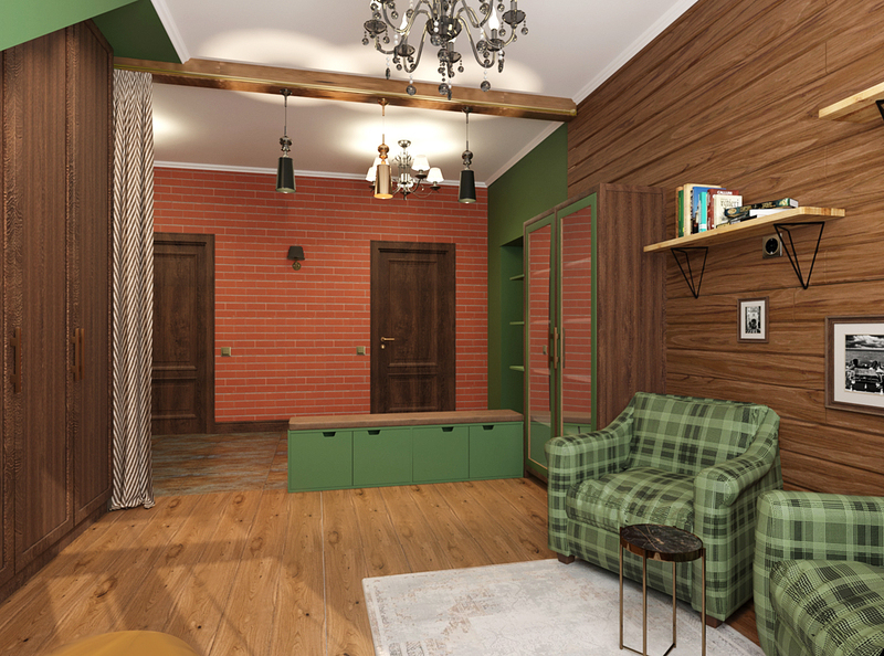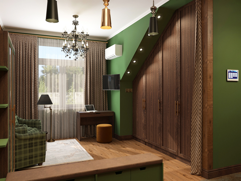 В нише, сбоку кровати, встал туалетный столик, который подчеркнул ассиметрию изголовья кровати. Также я усилил эко-мотив встроенным шкафом с реечным фасадом.