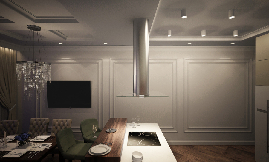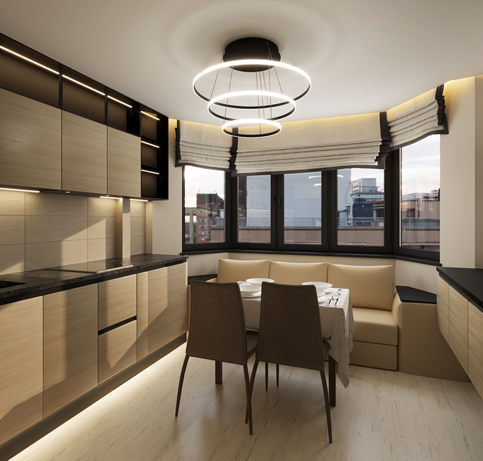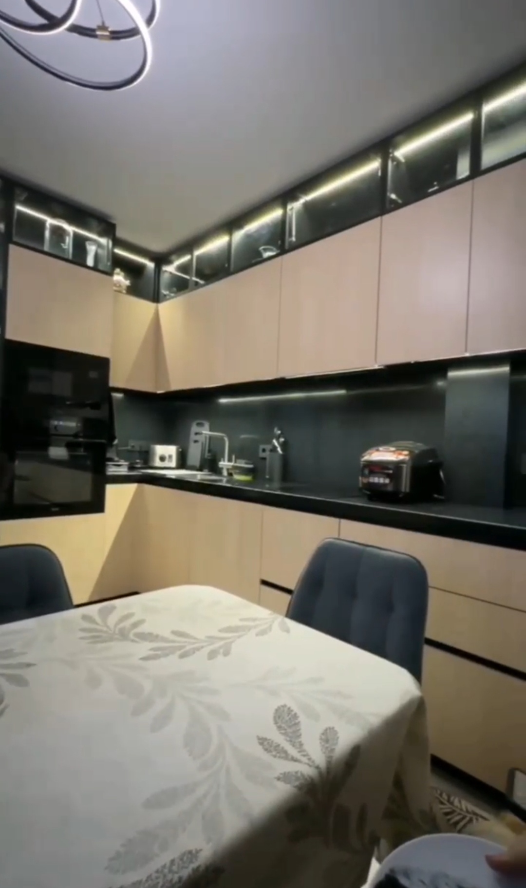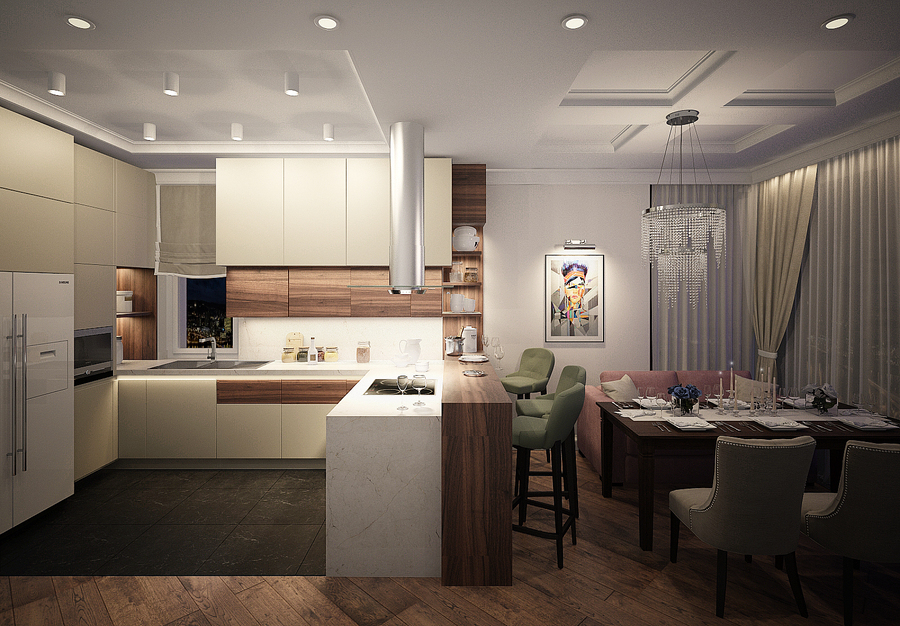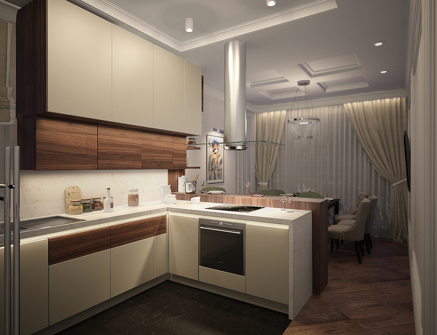 Дом с реконструкцией, 2015 г. На кухне, в потолке сделана ниша со светодиодами; натянуто светорассеивающее полотно с рисунком на заказ - получился авторский светильник!