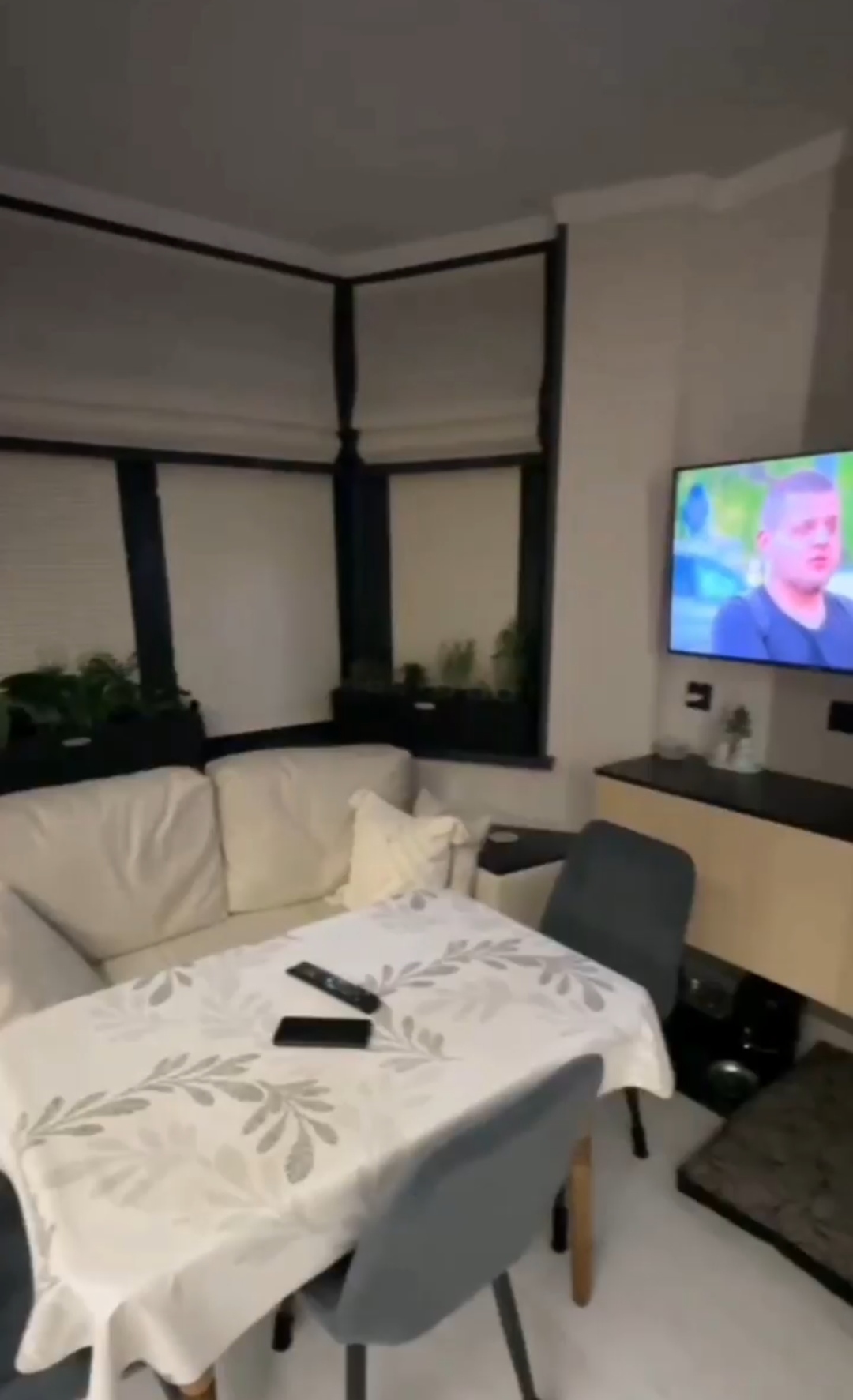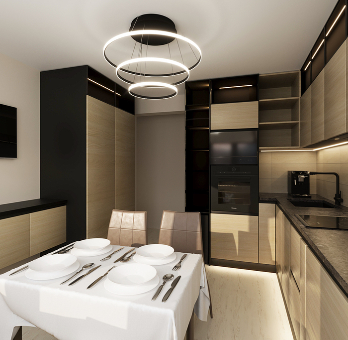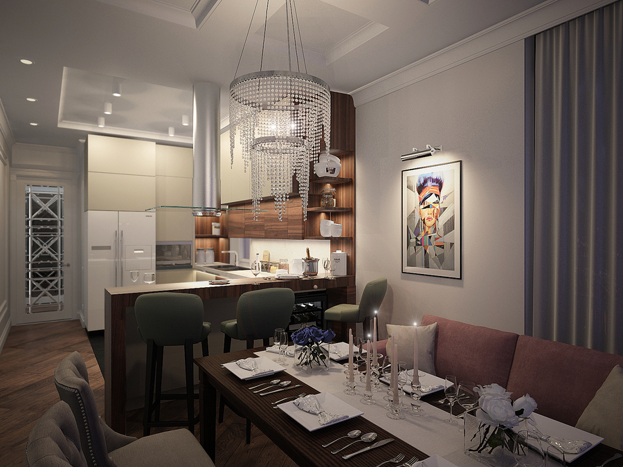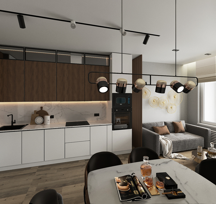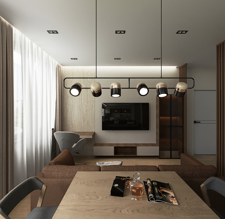 Журнальный столик гармонирует с люстрой. Одна такая минималистичная люстра сразу преображает весь интерьер.