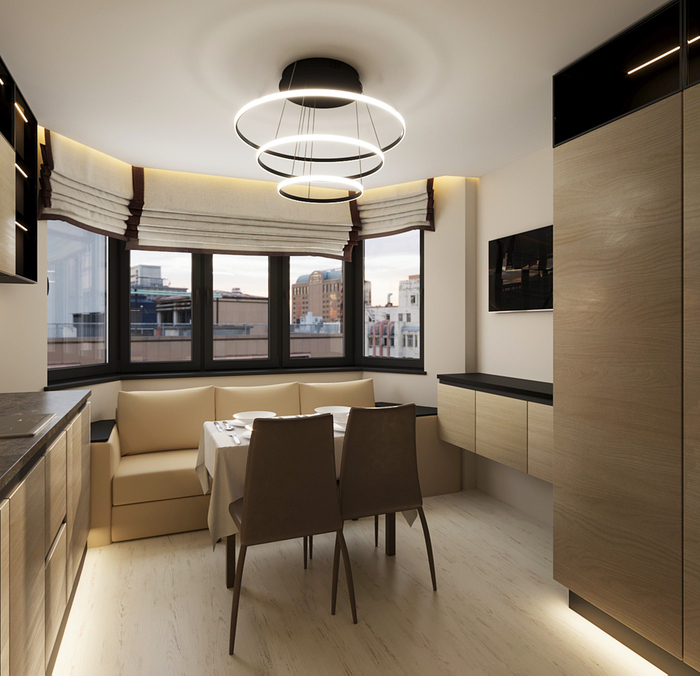 Из-за низкой высоты правильным решением были встроенные светильники. Тюли на окнах нет, чтобы не пропал объём. Для выразительности окно обрамлено лаконичной лепниной.
