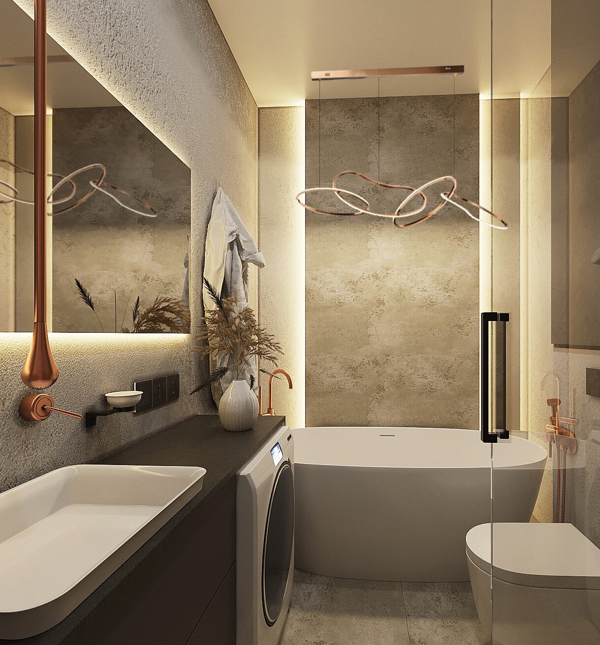 Интересное дизайнерское решение в санузле - сделать излив для раковины не из столешницы или стены, а из потолка. Само управление (смеситель) будет в стене. Удовольствие недешёвое, но вау-эффект обеспечен!